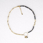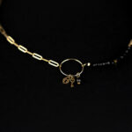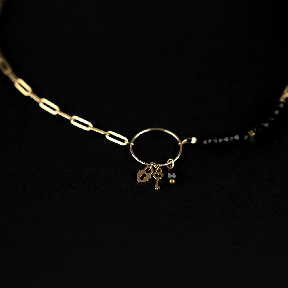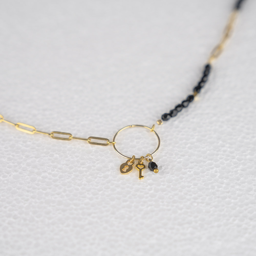 Collar con combinación de cadena de eslabones de plata con baño de oro con tupís negros. En la parte central de la prenda hay un aro cerrado de donde cuelgan diferentes elementos decorativos.