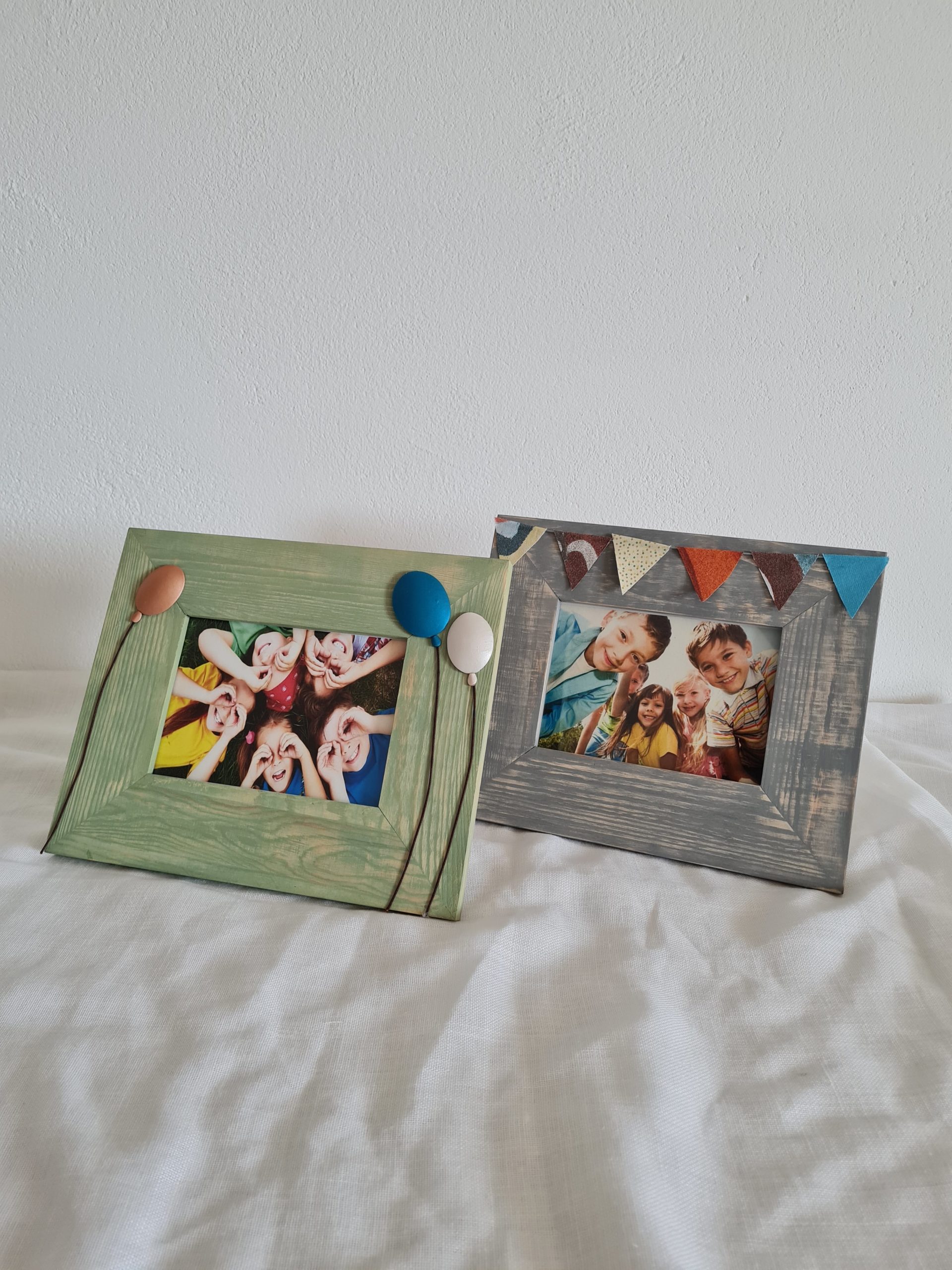 Marco de madera pintado de verde y decapado artesanalmente con decorado de globos.